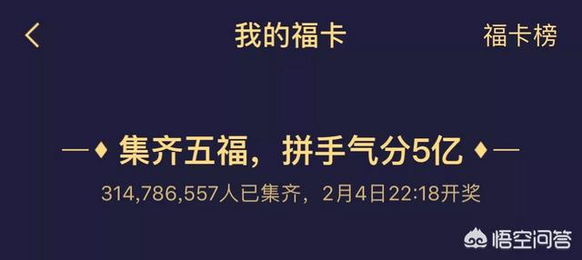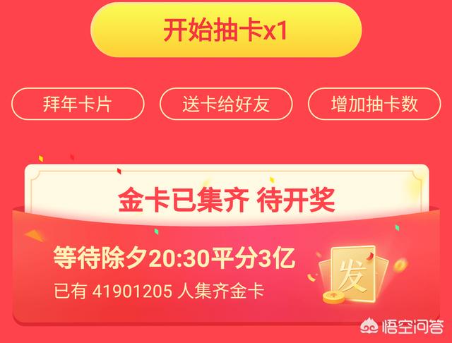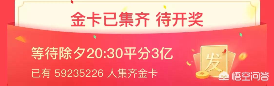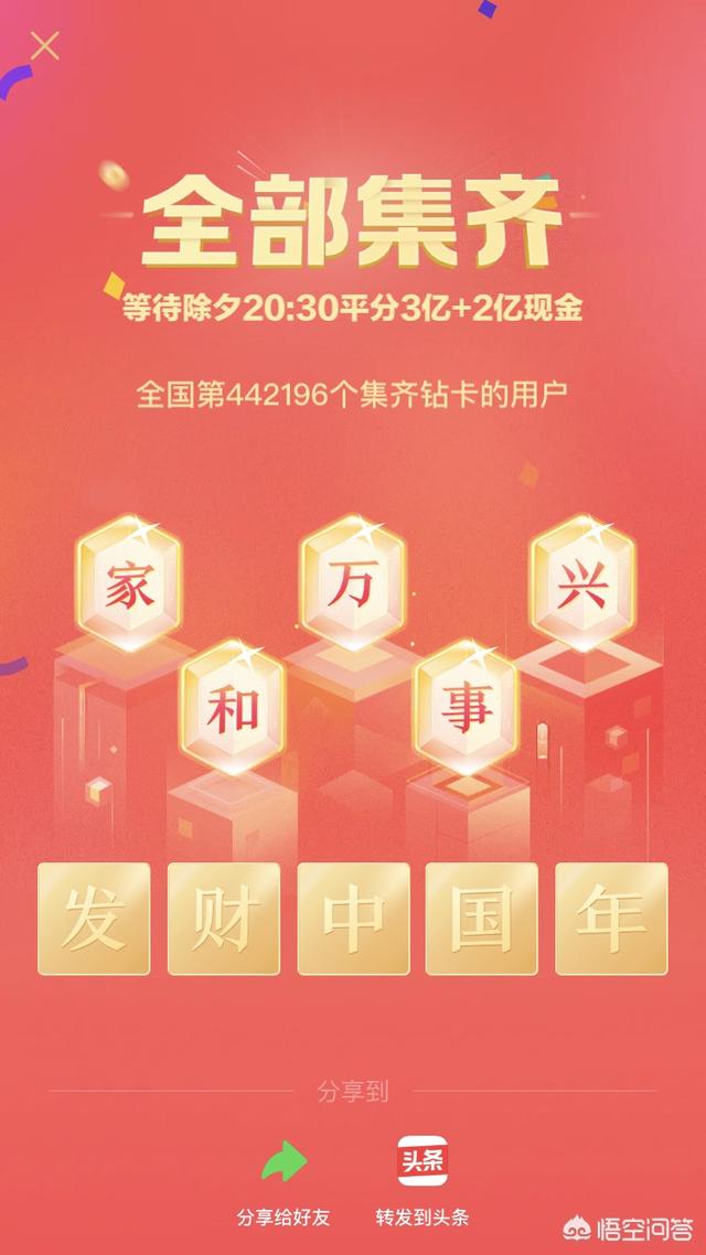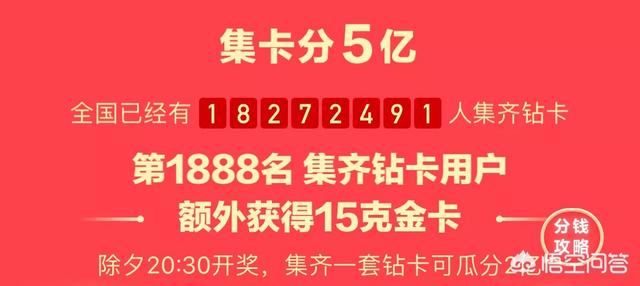 大概在20块左右 现在集齐金卡的人数已经超过五千万,预计在每天20:30一个能达到六千万,共同分享三亿,平均一下就知道集‘发财中国年’来说就有五块钱左右。 而集齐钻石更难了,现在钻石卡集齐的人数有三百万,预计在每天20:30一个能达到一千万,共同分享两亿,平均一下就知道集齐‘家和万事兴’来说就有20块钱左右。 但是按照平台的套路,可能20块都没有,这种东西大家还是见仁见智的,反正过年放假消磨下时间,图个开心也不错。 最后祝大家万事如意,新年发发发!谢谢! |