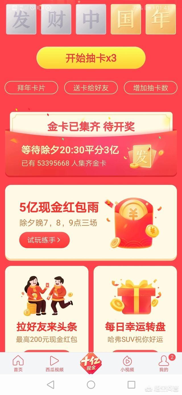 今日头条的发、财、中、国、年,家、和、万、事、兴集齐了,能分多少钱?春节节日大家也就是图个乐呵乐呵,如果想要赚多少钱估计是会让很多人失望的。今年春节红包比较大哦,支付宝、百度、今日头条都是豪气啊。不过真的把上述的字集齐了,也还是可以分到几十块钱的吧。 可以看到现在已经有将近5千万的人已经集齐了金卡,而且还会有更多的人会集齐,头条是拿出3亿元来奖励集齐金卡的。假设按照5千万人来平分,一个人也就只有6块钱。能够获得一个红包,在春节来说也就是图个吉利、乐和高兴罢了。 而另一个大头是钻卡,如果能够集齐钻卡,平分到的钱还不错。目前是头条是拿出2亿元来分给钻卡用户,而这个是比较难集齐的,到今天也才160多万集齐的用户。估计到除夕差不多有200万户集齐吧,平均下来一个人可以有100块钱。加上金卡6块钱,所以平均下来估计是106元钱左右。 当然即使是集齐这些字的用户也并不是完全就按照平分的原则,可能会采取随机的方式分得红包。所以有的人会大大超过106元,而有的人可能只有几十块钱或者几块钱那也怕是有可能的。 不过春节就图个热热闹闹,谁也不会指望抢红包发财吧。能够玩玩乐乐的赚个红包,图个来年吉祥如意、鸿运当头发大财的彩头,那不也是过年时愿望么。 不管怎么搞,我还是差“万”字啊,为什么就合成不了? 更多分享及互动,欢迎点击右上角关注【东风高扬】。 |