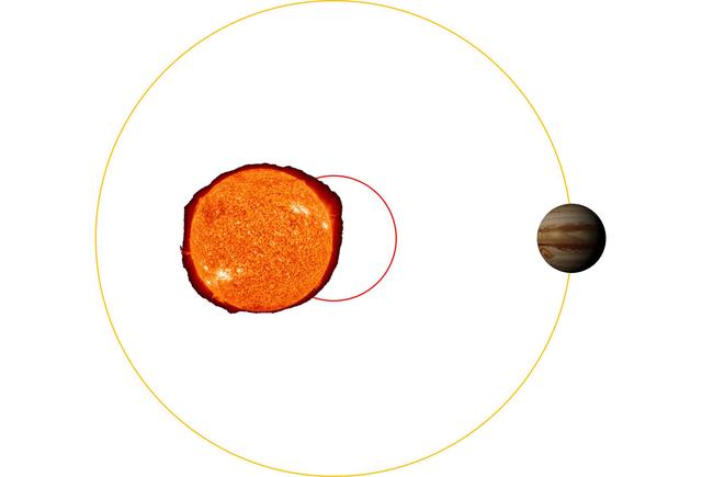 如果是木星,则共同质心更加远离太阳中心。除太阳之外,木星是太阳系中质量最大的天体,是其他七大行星总质量的2.5倍,达到了1.90×10^27 kg,大约是太阳质量的千分之一。木星和太阳的平均距离约为5.2 AU。把这些参数代入公式,可以得到x≈742725 km。因此,木星和太阳的共同质心位于太阳之外,距离太阳表面大约4.7万公里。太阳也会绕着这个共同质心做近似圆周运动。