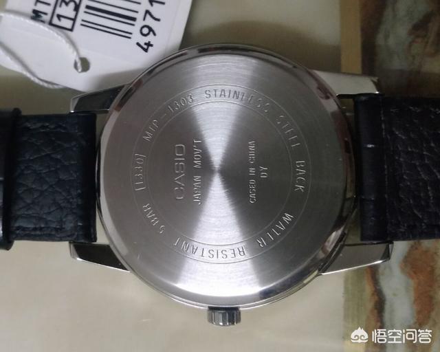 这款CASIO简约手表的背面,是精钢材质的表背底盘,整体光滑闪亮,凹字激光印刷,内容包含CASIO品牌英文字样,中国制造,日本机芯,防水5BAR及此款手表在CASIO家族里的具体型号等信息,精钢材质,光彩照人。手表侧面则是布局一颗多功能调节按扭,用户可以将此按钮拉出表冠,通过转动来调整时针,并按报时信号将表冠按回原位,因此款石英表功能简单,此按扭并无其他作用了。