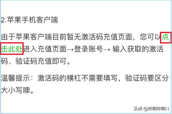 4、在苹果手机客户端页面点击绿色字体“点击此处”。这个界面对于安卓,网页端,iPad等激活的方式都有写到。
