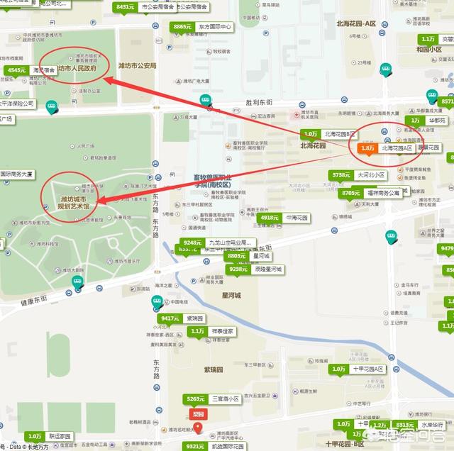 鸢都潍坊,最贵的小区均价1.8万,靠近市政府 很多人可能都不知道潍坊,它是山东的地级市,位于山东中部,由于是世界上最擅长做风筝的城市,被称为“鸢都”。 潍坊市是人口大市,人口近千万,2017年总人口936.3万人;但是人均GDP不太高,2016年人均59275元人民币(17年数据暂时没有)。 潍坊历史悠久。早在6000多年前,弥河故道旁就有人群定居。自夏以来,历代王朝政权在此封国建邑,设州立府。夏、商时期,境内有斟灌、斟鄩、寒、三寿等封国。 这样一座人口大市,风筝之都的城市,房价怎么样呢? 上图可见,潍坊的房价简单说,过去一年,一直在上涨,从来未停歇。 截止到八月份,潍坊房价均价6620元。在地级市中算便宜的。同比去年上涨了17.69%。 我们再看看不同城区。房价是什么情况。 打开二手房地图,可见潍坊最贵的城区是奎文区,7587元,第二是坊子区,均价6556元,后面是寒亭、昌邑区、寿光区,均价都在6千元以上,呈现东部偏贵和北部偏贵的特点。 我们放大最贵的奎文区,寻找潍坊最贵的小区。 放大奎文区后,不难发现梨园板块均价最高,一万元。继续放大梨园板块,寻找潍坊最贵小区。 放大后小编经过仔细对比,发现了上图标红的小区,均价1.8万,距离市政府和规划馆都不远。注意,紧邻这个小区南侧有个小区,均价只有3738元,这个价格不要太便宜。 你还知道潍坊其他更贵的小区么?欢迎留言交流。 潍坊夜景 |