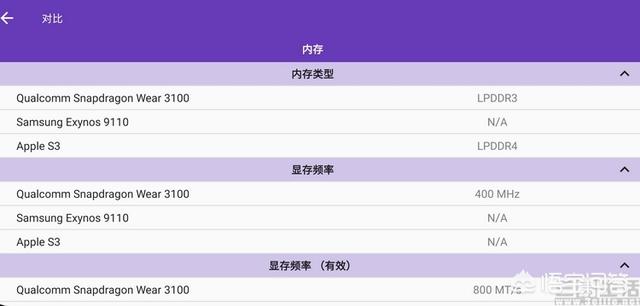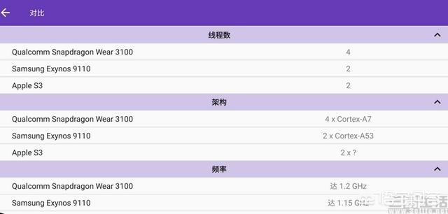 通过SoC-L软件的对比功能我们可以看到,谷歌Wear OS“御用”的高通Snapdragon Wear芯片以及苹果的S系列手表芯片,到现在都还在采用32位时代的古老架构,特别是高通现有的最新智能手表解决方案Wear 3100,甚至还在用28nm的半导体制程。这样的处理器不要说与那些本身就很孱弱的手环主控相比,就是和隔壁三星自用的手表芯片Exynos 9110比,无论是在计算效率、功耗,还是速度都难以占上风,因此这也就造成了许多“真智能手表”续航拙计的结果。