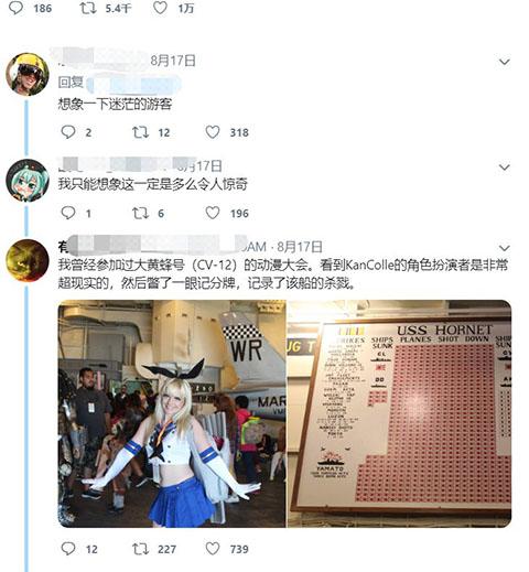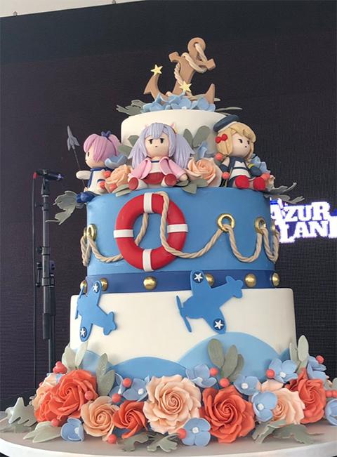 粉丝们站满了甲板,战舰的外壁上也贴满了舰娘的海报和装饰,现场还有许多Cos舰娘的小姐姐,当然了,还有巨大的生日蛋糕。
