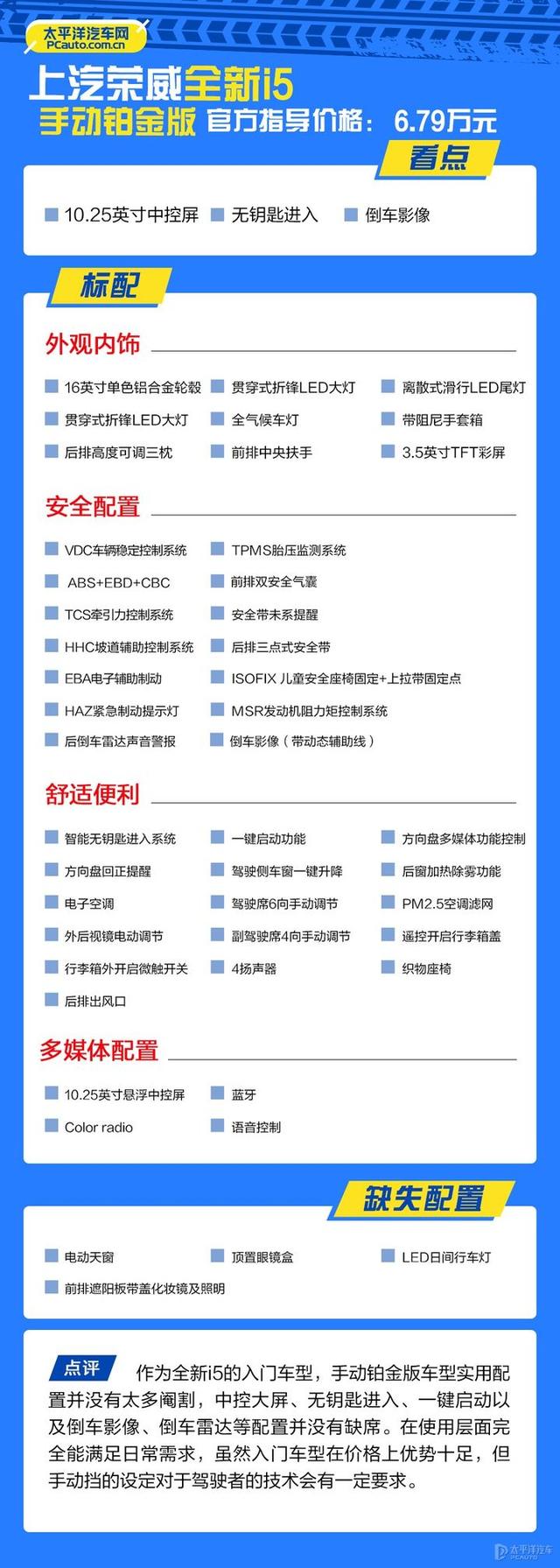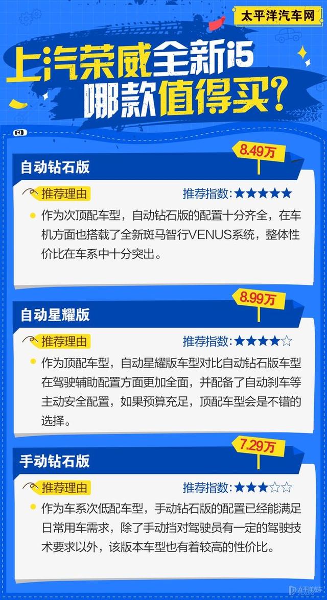 这台车长的是真好看,属于第一眼就觉得我对你有点小感觉,这两年荣威也好MG也好,上汽同门兄弟找到了设计上自己的思路,无论是MG6、I6、I5,看起来让人无法拒绝。但是有这么一句话叫做瓶子设计的再好看,水质如果不好,对不起也不能买。荣威的I5就存在这样的水质变质的风险。风险在哪?在于它七速的DCT双离合变速箱,这个变速箱实在是这辆车的一个大隐患。它同样的配备在荣威的X5、昂科威科鲁兹等上汽通用旗下的很多车型上。它们的投诉率居高不下,就是因为他们是干式的七速双离合变速箱,现在哪个厂家还在用七速干式双离合,所以宁愿大家推荐去买1.5自然吸气加cvt变速箱这个版本!毕竟外观再好看,配置再高,性价比再高,你得开着没毛病才行,所以1.5的自然吸气加CVT才是荣威五可以值得购买的选择,配置,动力匹配是没什么毛病的。当然荣威和名爵一样还有一个通病都是噪音太大,但是这个价位的车也没几款隔音做的特别好的