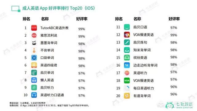 【TutorABC英语外教】、“流利说”旗下【雅思流利说】皆有高达 99% 的好评率,各英语学习 App 的评分差距不大。好评榜 Top20 中,“扇贝网”旗下共有 3 款。