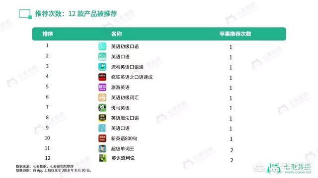 在这众多的 App 里,只有 12 款曾被苹果小编推荐过,【英语流利说】、【超级单词王】被推荐过两回。其中口语练习有 6 款,2018 年上线的有 9 款,可见,苹果小编更喜爱新上线的英语口语练习产品。