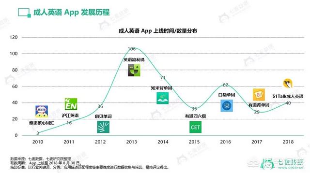 在七麦数据提取的数据中,共有 395 款成人英语学习 App,从 2010 年的 3 款 App 开始到 2013 年迎来爆发式增长,高达 106 款。这三年时间,英语自主学习进入了一个高速增长阶段,随后,2015 年降至 33 款,出现大幅波动。