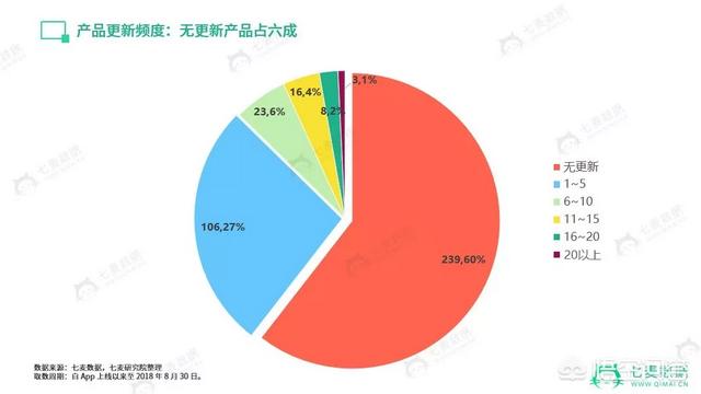 由于个人开发者众多,资金和精力有限,造成了大量 App 上线至今“无人维护”的状态,其中上线以来无更新的有 239 款,占比 60 %,更新 1~5 次有 106 款,占比 27%。相对而言,比较勤劳的要属【AI英语】,自 2018 年 1 月 12 日上线,8 个月来更新了 19 次,不断优化产品质量。