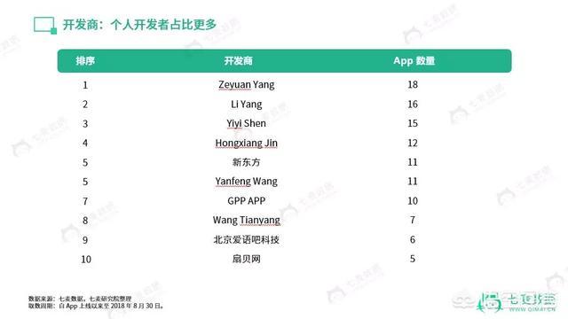通过分析发现,在这 395 款 App 里,共有 202 位开发商。其中,“Zeyuan Yang”旗下共有 18 款,“Li Yang”旗下有 16 款,前 5 名中,有 4 个均为个人开发者,教育大户“新东方”旗下共有 11 款,“扇贝网”有 5 款,“网易”仅有 3 款。可见,在英语学习 App 的市场上,并未有“一家独大”的情况,反而是百家争鸣,百花齐放。