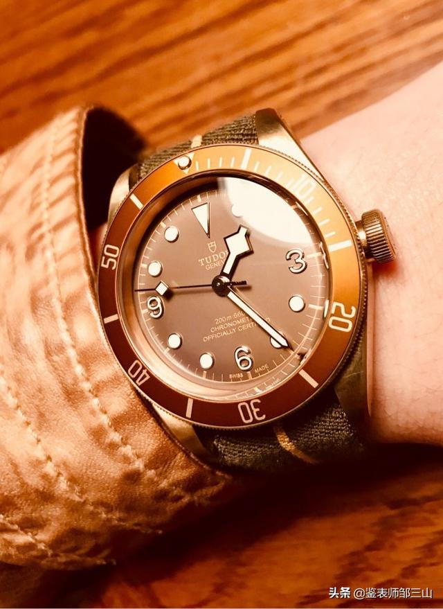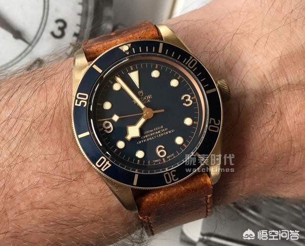 和老款相比,新款小铜花表带方面进行了相应的改变,虽然复古的棕色皮表带保持不变,但以法国海军降落伞帆布袋做灵感的织纹表带从卡其色改为深蓝色。这里插一下题外话,新款腕表的名字说起来也很有意思,它的全称是Black Bay Bronze Blue Bucherer特别版,所以可以简称为BBBBB,比老款的Black Bay Bronze(简称BBB)直接提升了两个逼格。现代人戴表不就是为了装B吗?这下子不用装了,直接戴就是了。而且,这是语言文化博大精深的我大天朝才能体会的幽默。