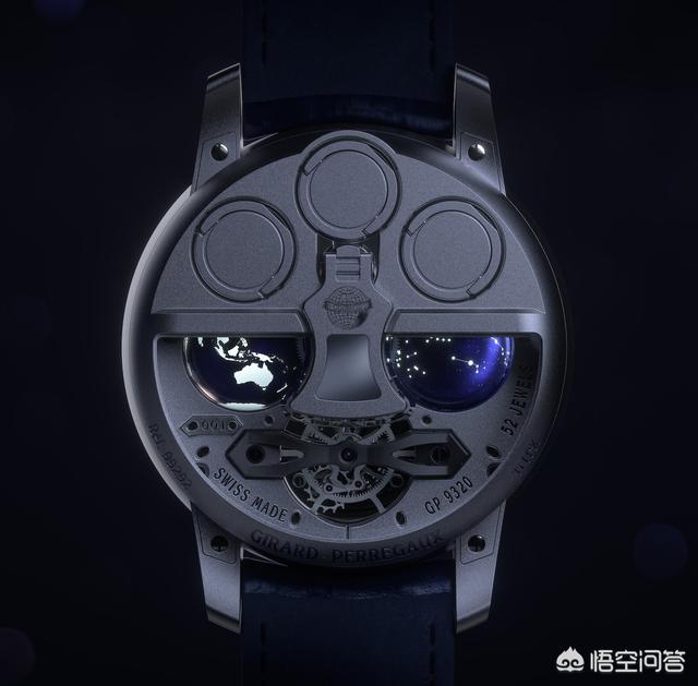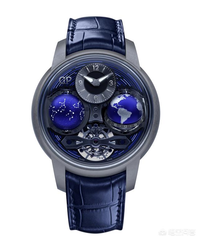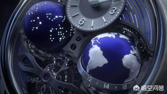 “宇宙腕表”,很直观,表盘上左右并列两个“星球”——3点钟位置是地球,9点钟位置是12星座的天球;12点位置是时分显示,6点钟位置是品牌标志金桥陀飞轮。