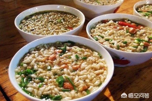 三江油茶,先将糯米蒸成饭,阴干备用,叫做阴米,作为主要原料。打油茶时将阴米放进烧沸的菜油锅内,炸成香甜爽脆的米花,然后将一把粘米放进锅里炒到焦黄,再伴上茶叶混炒片刻,加水煮开,过滤之后即成茶水,加进米花、葱花、姜丝、花生、黄豆、芝麻、时鲜瓜菜、红薯等佐料,配上猪肝、粉肠、瘦肉、虾米、牛背筋、酸鱼、酸肉等配菜,就是色、香、味俱全的可口油茶。