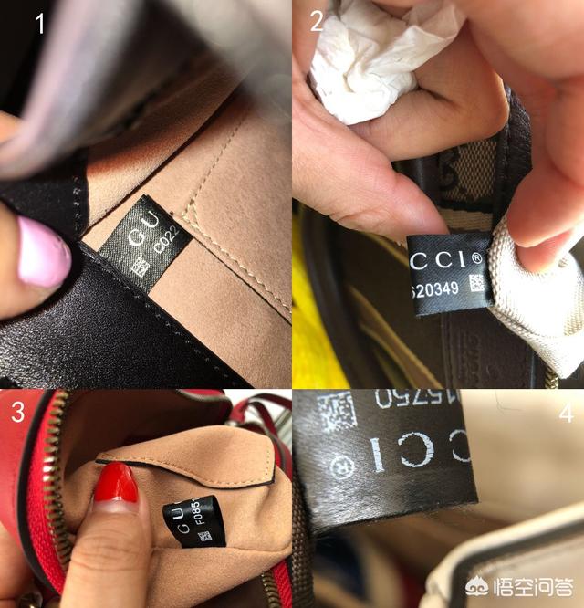 水洗标: 正品水洗标分层;上下颜色不一致;有脱丝现象;正品二维码与字体清晰,白色印字呈条状横向规则排列。 (图中1-3都是假的,只有4是正品) G中间有个一横平台,上端牙齿的角度;U左粗右细,上部两头有小墩子;C的开口小,上下细;I两头有墩子(因材质不同墩子未必都很明显);注意产地标的比例间隙。 |