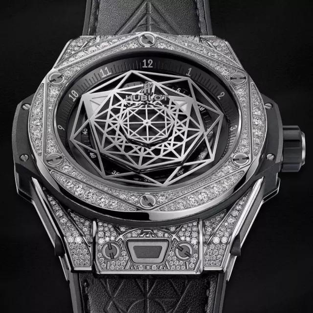 最新的Big Bang Sang Bleu表款,设计工作的参与者包括来自伦敦的文身艺术家Maxime Buchi,Maxime Buchi的客人不乏嘻哈巨星Kanye West(侃爷)等重量级人物。这款手表售价将近1.9万美元,全球仅限量发售200枚。