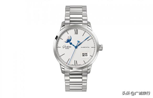 格拉苏蒂原创议员系列腕表这款格拉苏蒂原创议员系列1-36-04-01-02-70腕表采用精钢材质打造,表壳直径40毫米,厚度12.2毫米,具有50米防水性能。采用浅银色霜状纹漆面表盘以及激光切割电镀黑色时标和与之相配的轨道式刻度圈。搭配的精巧蓝钢指针确保了时间的易读性。在6点钟和12点钟位置设有典型的罗马数字,在4点钟位置设有大日历显示窗口。在10点和11点之间设有弧形月相窗口,月相盘是在位于普福尔茨海姆的自家表盘厂以繁复的手工进行制作。以钻石细心切割月亮优雅的曲线,在点点繁星的电镀蓝背景衬托下鲜明耀眼。内部搭载36-04自动上链机芯,可提供100小时动力储存。