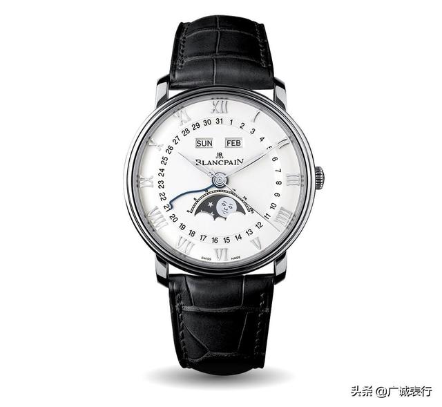 宝珀经典系列腕表这款宝珀经典系列6654-1127-55B腕表采用精钢材质打造表壳,直径40毫米,厚度10.7毫米,具有30米防水性能。搭配白色表盘,带有时间、日期、月份、星期和月相显示功能,各项内容布局合理,显示清晰。6点钟位置是月相显示功能,月相显示盘非常经典和富有趣味。四周环绕着星星的月亮被绘制成人脸的样子,似笑非笑,十分有趣。内部搭载Cal.6654自动上链机芯,可提供72小时动力储存。
