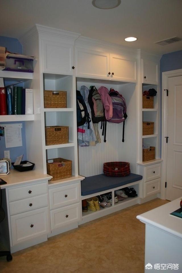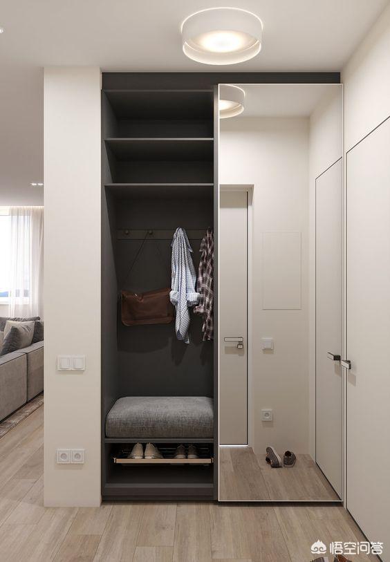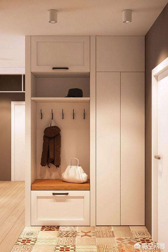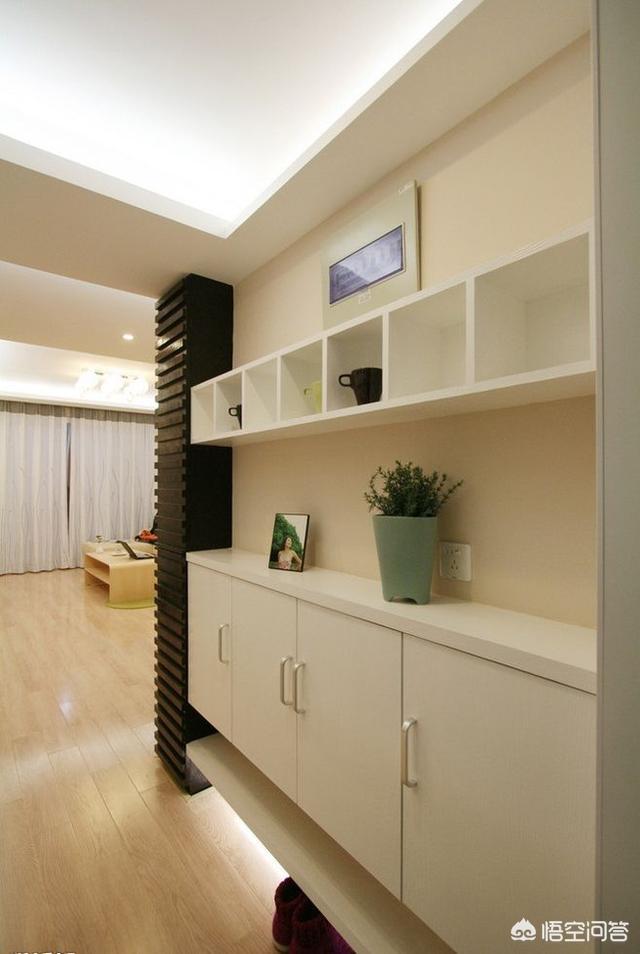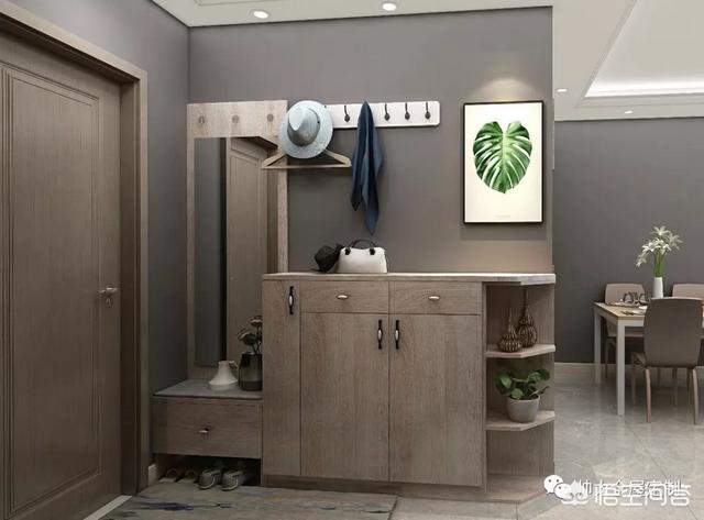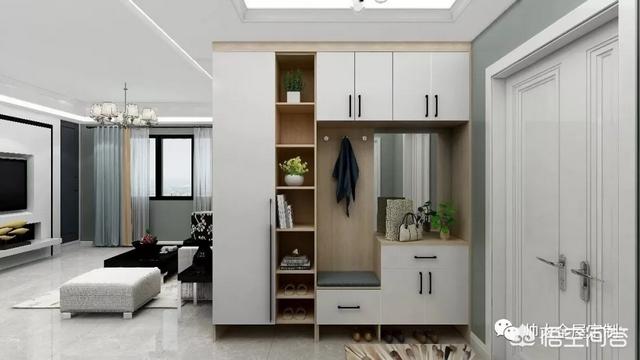 旁边的柜子可以充当杂物存储等,很是方便。整个空间显得更大更立体,但是因为没有柜门的遮挡,又是在玄关处,进门就能看到的地方,建议东西不要放的太满。