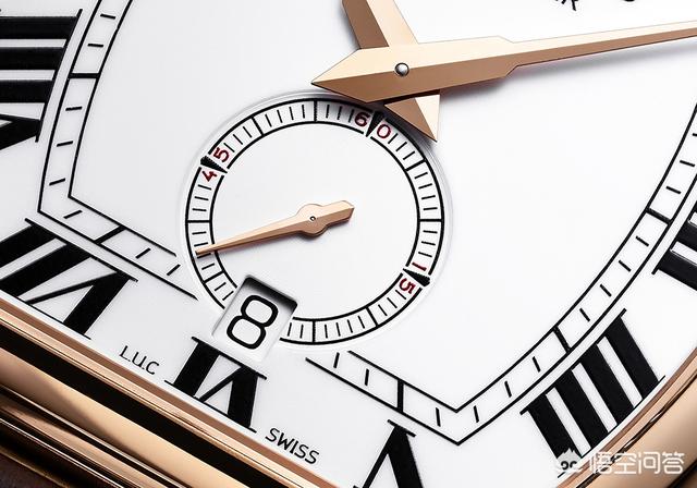 表盘具怀表风格,以罗马数字小时刻度配轨道式分钟刻度圈,小秒盘及日期窗均置于6 时位,衬特别设计的太妃式菱形纹指针。盘上印有「LUCHOPARD」及「CHRONOMETER」字样,另外不妨留意「VI」刻度两边分别写有「LUC」及「SWISS」字样,有别于一般常见的「SWISS MADE」,这可说是LUC 的一个小特色。