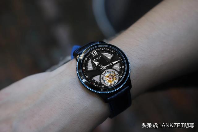 腕表直径40毫米,厚9.8毫米,采用经典的三片式结构精钢表壳,配以黑色太阳放射纹表盘,纤长的蓝色秒针在表盘上显得格外亮眼。