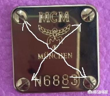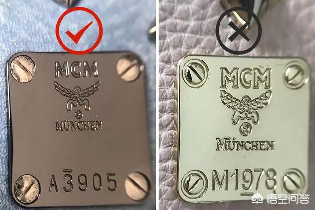 mcm和其他品牌不一样,有一块特殊的五金标牌,五金标牌上的刻字十分有意思,左边正品右边假货。正品五金标上面的刻印是非常清晰的双线刻印,假货的刻印,刻印的线条不够细致,