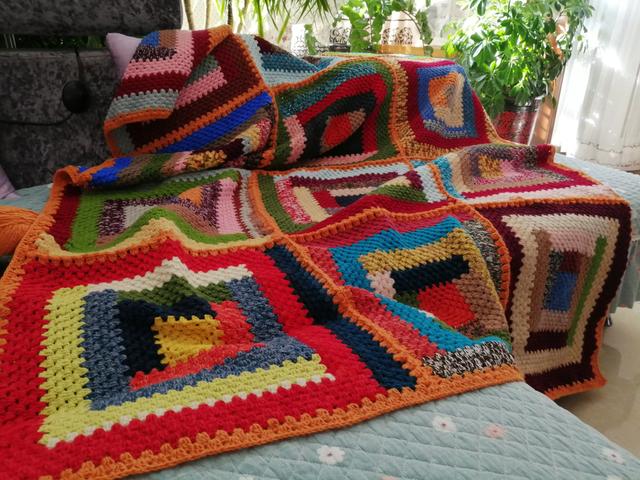 6、直到把整个框架上的毛线全部固定好。我们用剪刀将毛线从框架上剪下来,翻过来,垫子就做好了。可以铺沙发,凉椅,地面等等。