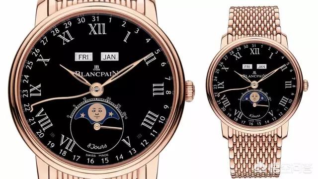 宝珀Villeret系列有着显著的特点,Villeret系列所有的腕表都具有双表圈的表壳,罗马数字的时标以及搭配柳叶形的指针,这三样设计奠定了宝珀Villeret系列经典的地位。腕表采用了黑色表盘设计,在腕表的12点钟位置设有星期以及月份显示双窗口,腕表6点钟位置设有月相盈亏显示装置。