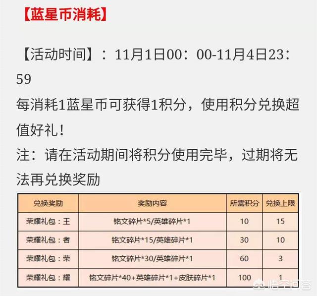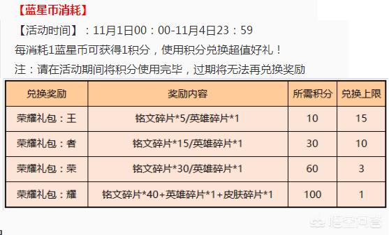 “蓝星币消耗”活动新增的“蓝星币消耗”活动的奖励并不给力,前三个礼包都只是铭文碎片+英雄碎片,这对于老玩家来说根本就没什么用,而最后一个礼包虽然有一个皮肤碎片的奖励,但是却需要消耗100蓝星币,完成难度较高,建议大家还是之兑换第四个礼包就好。