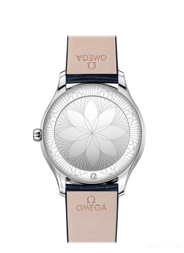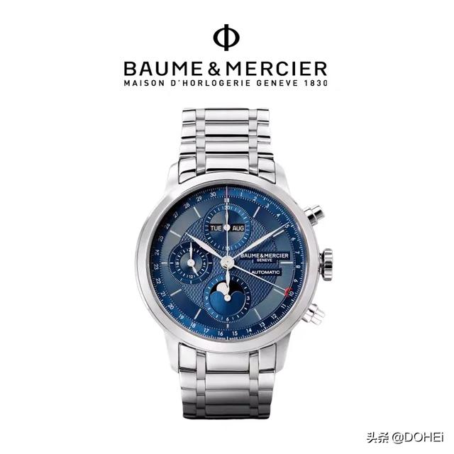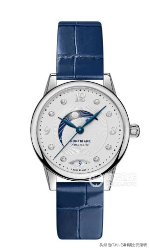 搭载石英机芯,密底设计,防水100米。搭配与之相称的蓝色小牛皮表带,镶饰“M”品牌标志。