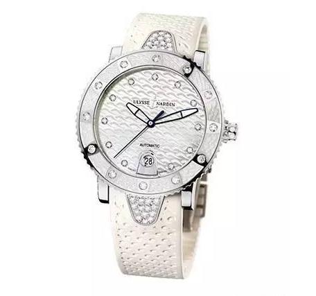 雅典腕表具有浓郁的航海气质,包括这枚女表,外形设计航海气息浓郁。这枚腕表搭载自动机械机芯,不锈钢材质,表盘和表壳上有零星镶钻,橡胶表带,具有日期显示功能,表径40毫米,防水100米,参考价格103300元(以实际价格为准)。