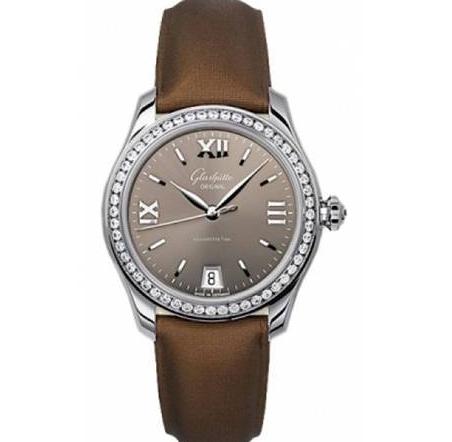 格拉苏蒂原创的女表意义来非常有韵味,包括这枚腕表,表带为深棕色织缎材质。这枚腕表为自动机械机芯,不锈钢材质表壳镶钻,具有日期显示功能,表径36毫米,防水50米,参考价格104500元(以实际价格为准)。