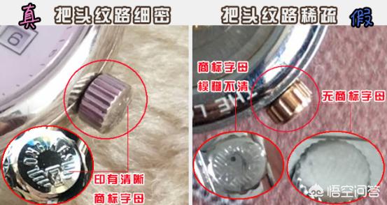 而仿品的表把头纹路稀疏