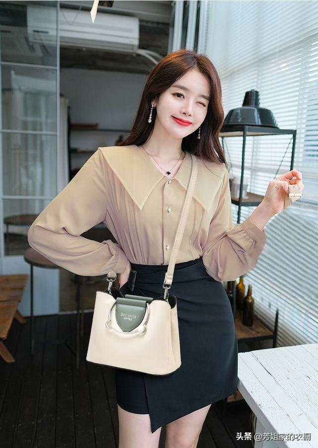 颇显洋气与大方米色衬衣,搭配深色系短裙配上米色包包更是一种优雅中的清爽,和带有知性的女性化妩媚.