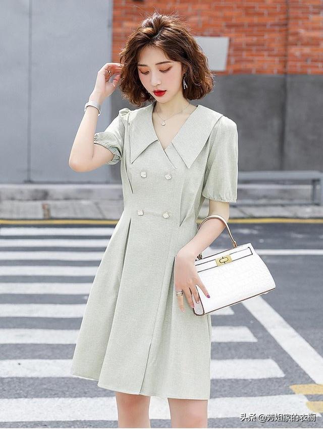 简约风格的豆绿色连衣裙,搭配米色包包,给人一种青春活力的感觉
