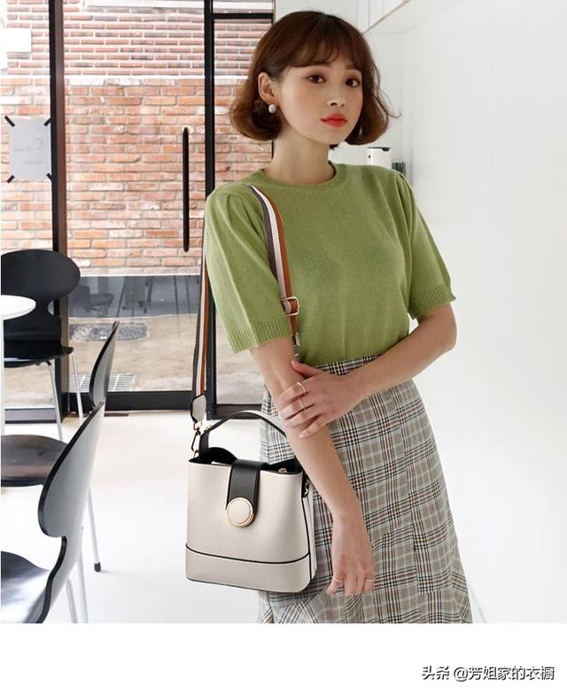 卡其色方格一步裙搭配小款青绿色上衣,更是一种优雅中的清爽,和带有知性的女性化妩媚!