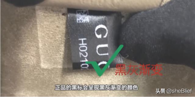 5、真品Gucci袋内部有个小标签,标签外面注明“Gucci-MADE IN ITALY”,内部则注明款式号码(model nos)及批号(batch nos),假货内衬标签上的字体则可能较为模糊,标签背面也没有编号。