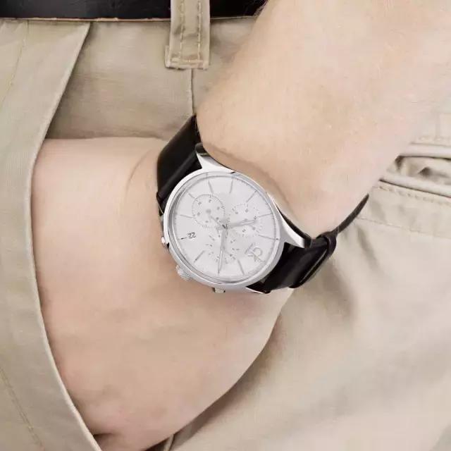 CK这款Gents系列男表依旧承袭美式简约风,整个表盘颜色灰白相间,三个计时盘均匀分布在表盘中间,四点钟位置日期显示功能,精钢棒形指针顶端有荧光涂料层。搭载瑞士石英机芯,走时精准度没什么问题。