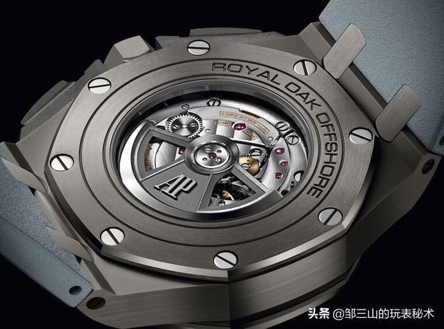 灰陶瓷皇家橡树离岸型搭载的是ROO计时码表常见的3126/3840机芯,功能特征为左三眼表盘布局的计时功能加上日期显示,而机芯本身的规格例如震频21,600vph、 59颗红宝石以及动力储存50小时,再加上双边镂空的双向上链自动盘等,这些都是现代机芯比起过往进步的证据。3126/3840这枚机芯是在爱彼自制的3120系机芯上加装计时模组,这套模组如前所述是左三眼配置,比较特别的是它的小秒针是位在12点钟,而非一般左三眼常见的9点钟,这点是佩戴这款表时可以注意的特色细节。