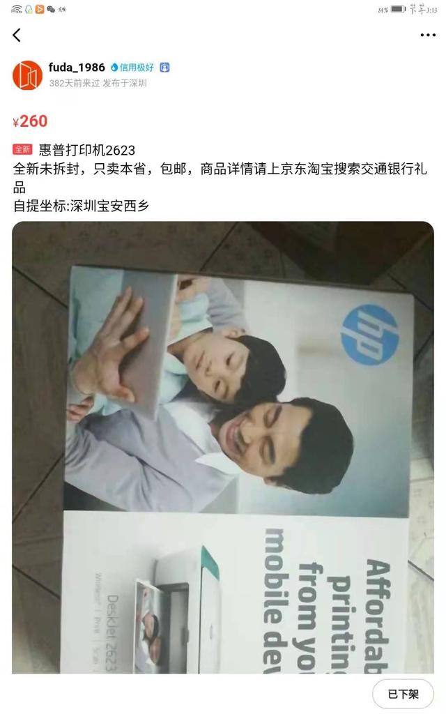 综述:绝对可信 我是过来人,对于闲鱼上便宜且未拆封的商品,别听人乱讲,是没有任何问题的,错过了机会,就不好了。 我曾经在上面买过一个全新的惠普2623打印机,原价999元,我花了260就拿下了,面对面交易,因为卖家刚好就在附近,全新未拆封,打印机都是我个人组装起来的,截图附在最后。 后面,我终于搞清楚了,为什么闲鱼会有那么多全新且未拆封的低价商品,主要有两个原因。 信用卡积分兑换像我淘到的打印机,连邮包都没有拆开,我从寄送单看到,这是使用银行信用卡积分兑换的,怪不得价格那么低,而且有各种刷积分的方法,尤其是做生意的,我的卖家就是做生意的。这些用信用卡积分兑换的商品低价卖是一点儿都不心疼。 24期免息套现接下来才是最厉害的操作,为什么闲鱼上有这么多低价、全新、未拆封的商品,就是因为很多人利用电商平台的24期免息卷去购买电子产品,在以稍低的价格出售“套现”,这个方法简直是绝了,还省下了分期费用。现在很多金融平台都是要分期费用的,而且利息很高,那些人也真是天才! |