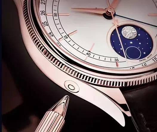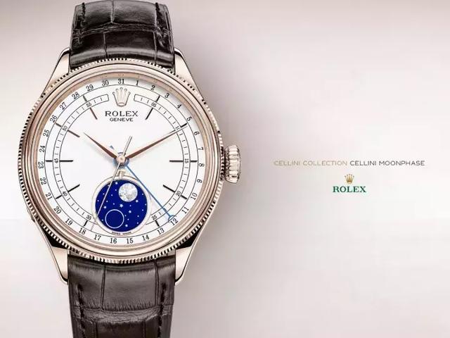 2017年推出的劳力士切利尼月相配有白色漆面表盘,位于6点位的月相显示盘则采用蓝色珐琅工艺。在显示满月和新月时,满月以圆形陨石象征,新月则以银环代表。