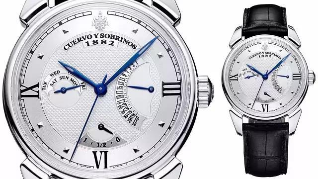 这款设计灵感来自于上世纪40年代古巴哈瓦那的环球触角的库尔沃手表,是这个品牌的标志性原创手表。银色表盘上打造了精美的双层表圈,内圈打造了优雅的巴黎钉纹饰,外圈罗马数字与粒状刻度相结合。配以古典的蓝钢大三针,表盘两侧是具有飞返逆跳功能的星期和日历窗口,每个月和每个星期的最后一天,你都能欣赏到指针瞬间跳回起点的奇妙乐趣。