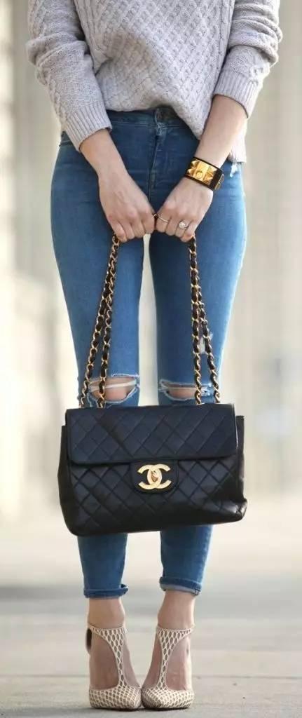 这两款经典的Chanel的链条包斜挎在身上,橙色的小包有活力,蓝色的大包静谧又高雅,整体优雅又有个性。