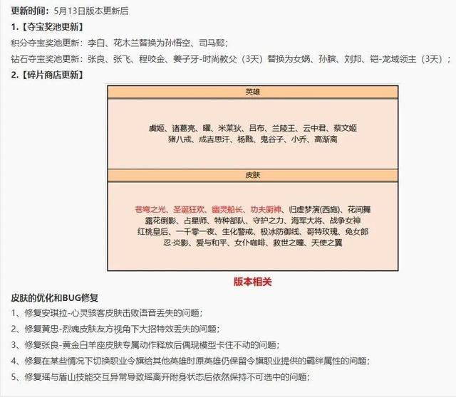 王者荣耀5月13日正式服更新,消耗钻石获得积分活动,碎片商店替换更新。 13日更新后至17日期间,消耗钻石可以获得对应的积分,可以兑换到英雄皮肤碎片宝箱,与之前的活动一致,保底获得十个英雄碎片和十个皮肤碎片。 对局获得幸运礼包,可以几率开出五位永久英雄,最多获得八个礼包,另外累计登录三天可以获得六个礼包,挑战任务可以获得三个礼包。 两款皮肤秘宝上架,可以开出缤纷独角兽、天才门将、坚韧之力、黄金白羊座、地狱火、孙策-猫狗日记、街头霸王等皮肤。金币头像框礼包可以开出小鹿头像框头像框*1、五月天开黑头像框*1、浓情端午头像框*1、里约吉祥物头像框*1。 夺宝奖池替换为孙悟空、司马懿、女娲、孙膑、刘邦。碎片商店替换为吕布、诸葛亮、成吉思汗、杨戬、苍穹之光、圣诞狂欢、幽灵船长、功夫厨神等。 |