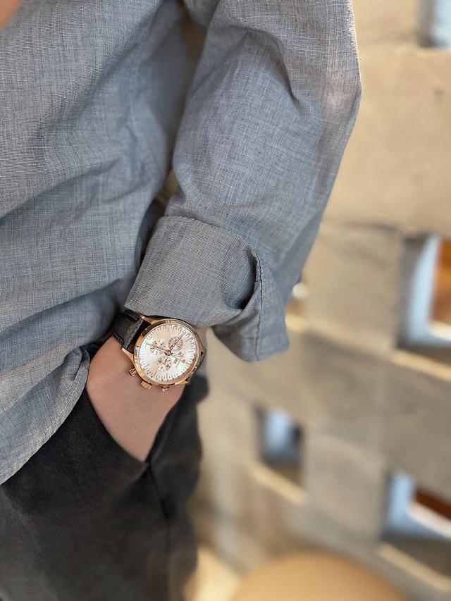由于第二时区刻度圈位于内圈,故第二时区的小时同样以短针指出,看起来更顺眼,其特大黄色V 形针端更与品牌的经典符号相呼应。指示本地时间的时分针为巴顿式镂空设计,带来更轻盈观感。另外,日期窗设于内盘的3 时位。
