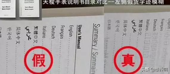 真的天梭机械表说明书字迹较细,而假的手表则略显粗,下图左侧比右侧的略粗,显然左侧的是假的天梭表。