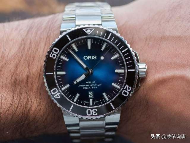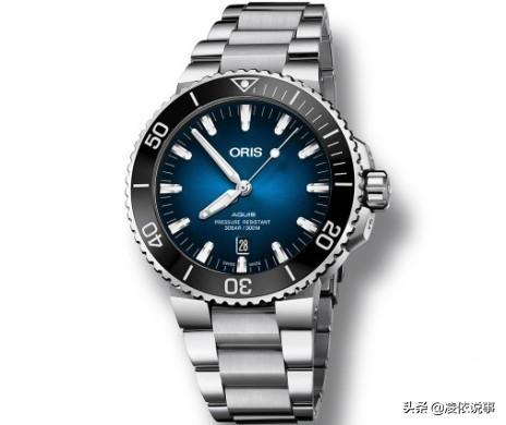 腕表直径39.5毫米,厚12.5毫米,采用不锈钢表壳,配以黑色陶瓷单向旋转潜水表圈,渐变蓝色表盘看起来非常梦幻。