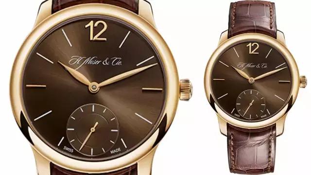 褐色的表盘上简化到只保留最必要的元素,金色的柳叶指针和小秒针巧妙地诠释极简主义理念。腕表搭配了金色的表圈、手工平缝制的褐色鳄鱼皮表带。值得一提的是,亨利·慕时机芯的所有细小零部件均由品牌自主研发打造,腕表搭载了自制机芯HMC 321。