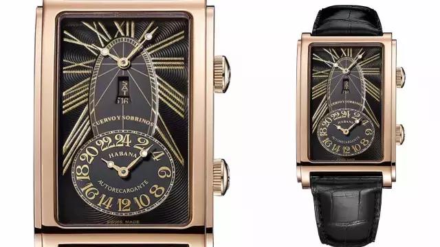 尊贵18K玫瑰金表,表壳灵感来源于库尔沃家族早期保险柜设计,霸气双机芯双时区双表把款,呼应Prominente名流系列大号雪茄的命名由来。方形复古,尊贵属于少数人的选择。典雅黑色表盘雕刻细腻蔷薇花纹,张扬大气罗马雕金数字刻度,古巴风格夹板圆船首设计搭配星期日期显示窗。