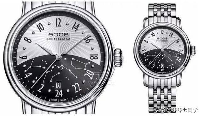 金属感很好,十分抢眼的表盘设计,表盘使用独家的24时盘面设计,巧妙的用黑白的强烈对比来区分昼夜,下半区的黑色盘面代表夜间,并辅以带有夜光涂层的星座修饰,分别有巨蟹座,水瓶座,双子座的星座图,营造出黑夜上的满天繁星。