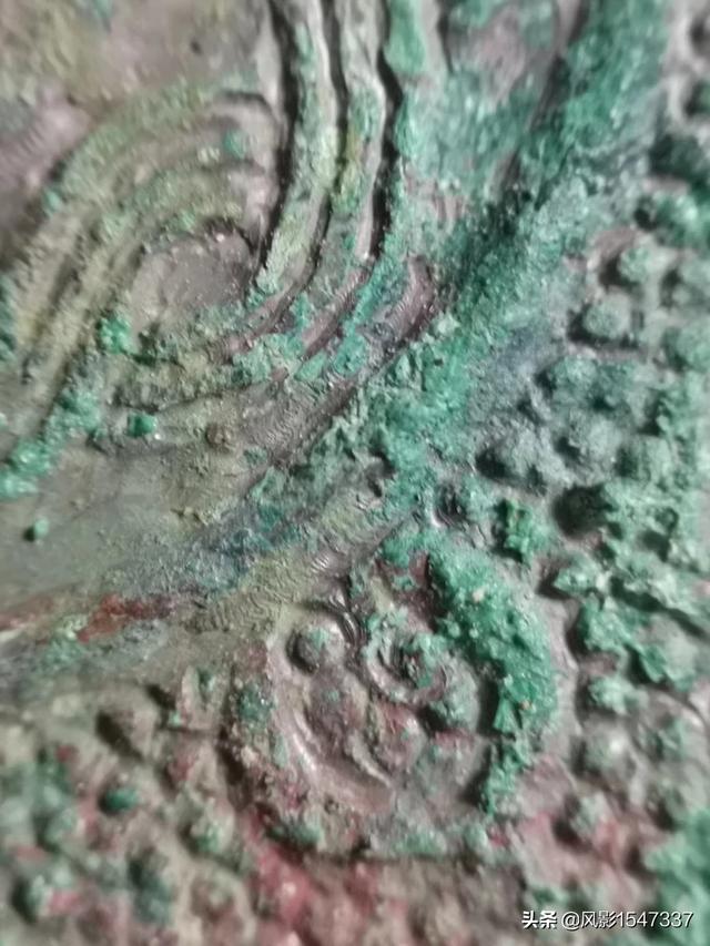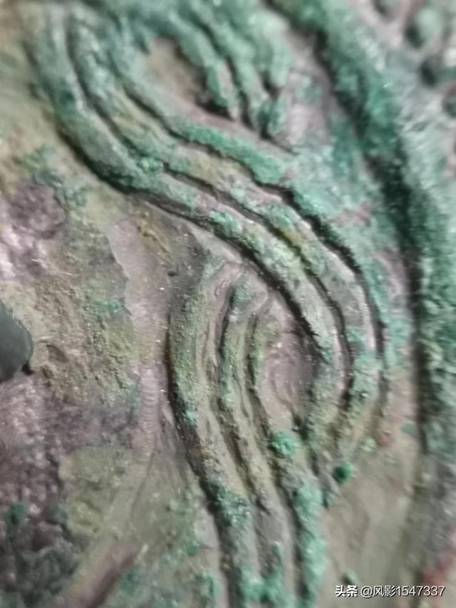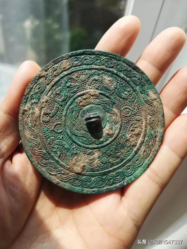 春秋战国二弦钮青铜镜。一般青铜镜大多采用范模铸,而这面镜却是极少采用的剔地平雕工艺,首先以范铸镜坯,然后绘图减地凿雕,放大后可见局部刻刀痕。刻铜工艺存在很大难度,稍有疏忽就会前功尽弃。这面铜镜纹饰细密、规整,图案十分精美! |
